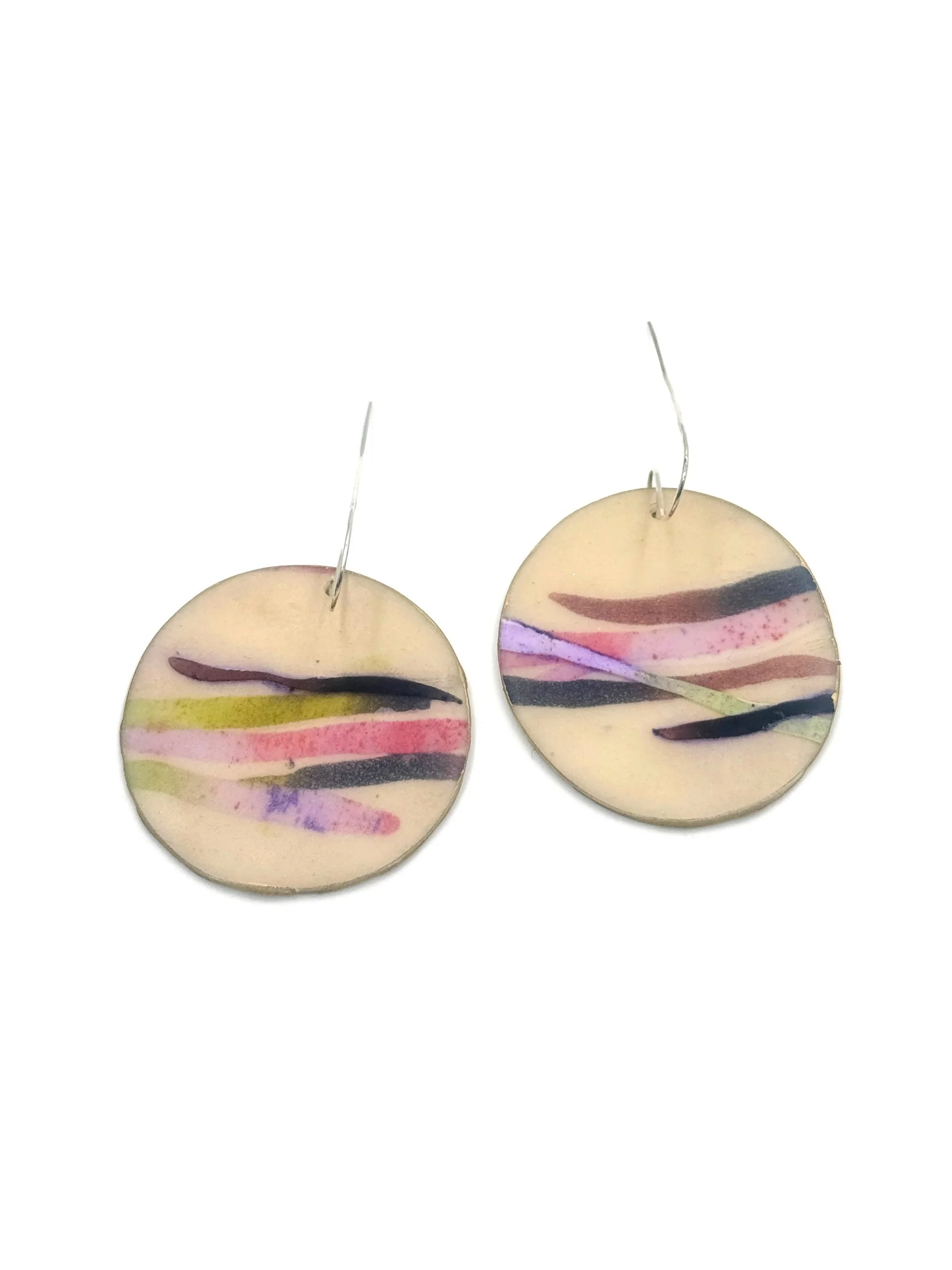 Minimalist and earthy, these handmade earrings feature a soft abstract blend of ecru, olive green, brown, black, and muted purple tones.